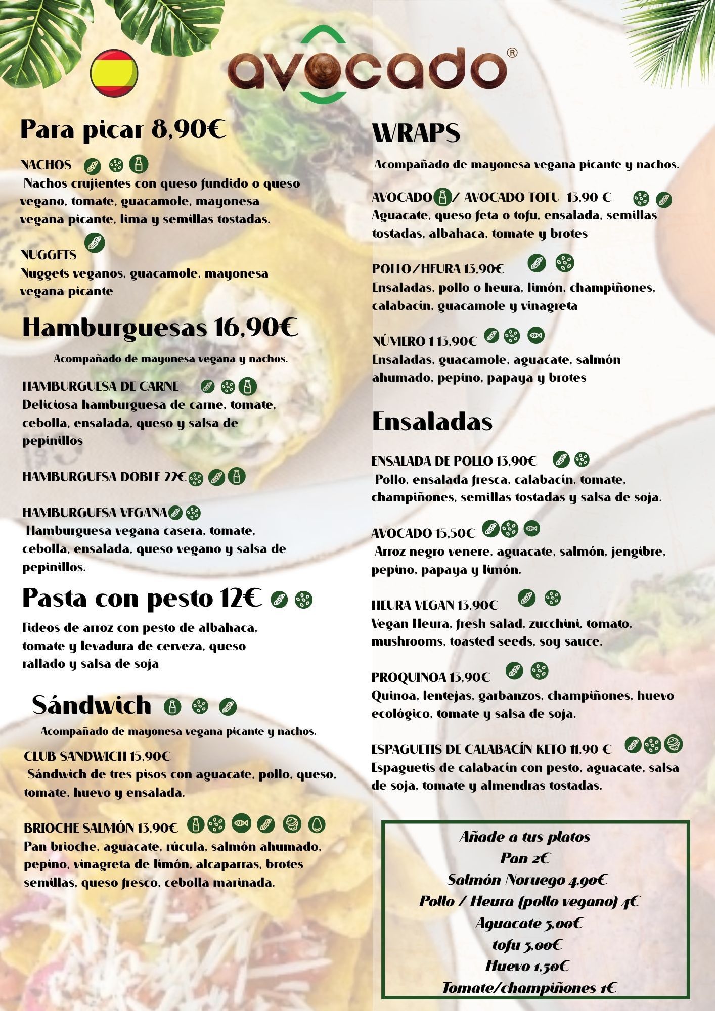 Guacamole, aguacate, ensalada, salmón ahumado, pepino, papaya y brotes
