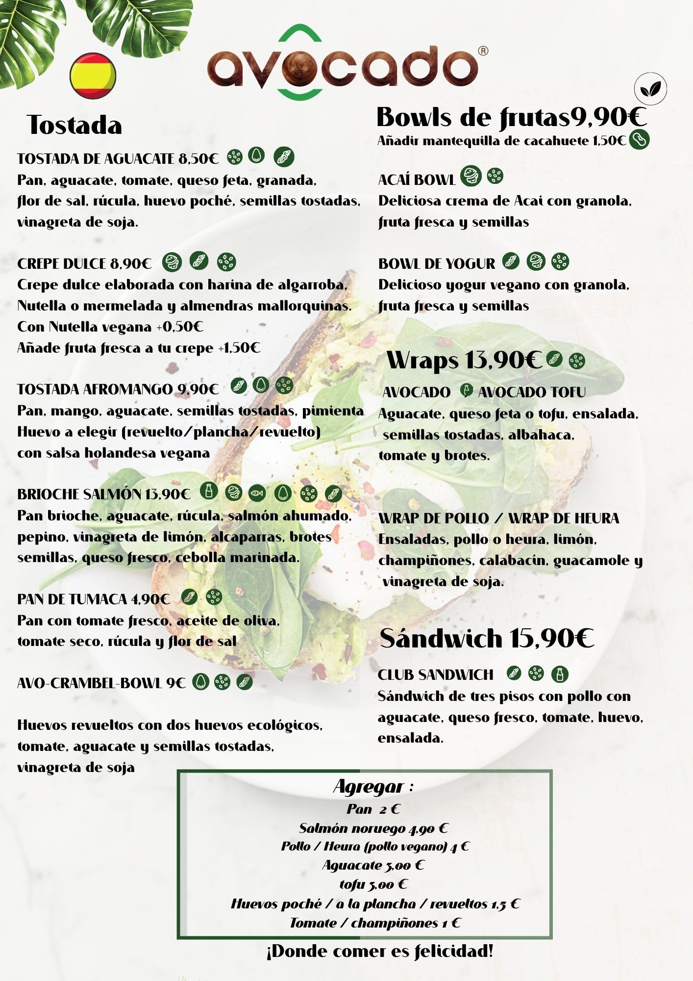 Aguacate, queso feta o tofu, ensalada, semillas tostadas, albahaca, tómate y brotes